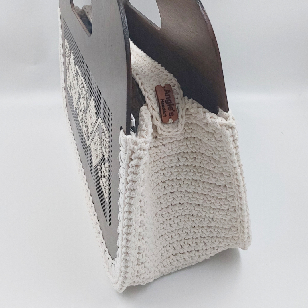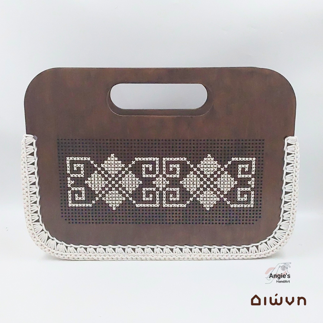 Η «Διώνη» αποτελεί ένα από τα πιο εκλεπτυσμένα κομμάτια της συλλογής Κλωστή & Ξύλο. Συνδυάζει το φυσικό μεγαλείο του ξύλου με την απαλή, χειροποίητη πλέξη και τη παραδοσιακή τεχνική του κεντήματος. Δημιουργήθηκε έτσι μια τσάντα που αποπνέει διαχρονική κομψότητα και ήρεμη δύναμη.