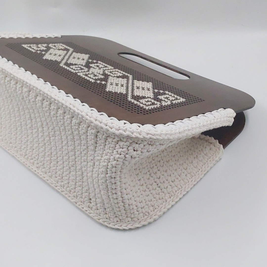 Πλέξη από premium νήμα με άψογο φινίρισμα (Νήμα 85% βαμβάκι και 15% πολυέστερ, σε ιβουάρ χρώμα. Διαστάσεις 30x40cm. Επένδυση με φόδρα στα πλεκτά και κεντημένα σημεία. Κέντημα με κλωστές DMC)
